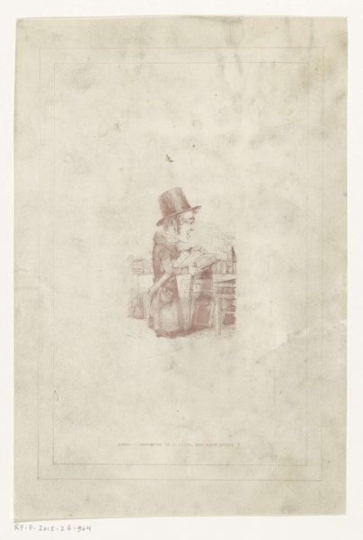 Editor: So, this is "Staande figuur in een cirkel" by Anthonie van den Bos, created sometime between 1778 and 1838. It's an engraving, with ink, a fairly small drawing it seems. It gives me a sort of medieval vibe, and I'm curious about the man, the bag he's holding, and how that relates to the material production of images at that time. What strikes you about this piece? Curator: Considering it as an engraving, it's interesting to think about the means of production for such an image. Engravings facilitated the reproduction of images; this piece allows the democratization of imagery, taking images and knowledge from the elites to society as a whole. Editor: That's interesting; it seems more efficient for art diffusion, not unique artworks. Can you elaborate? Curator: Yes, of course. Looking closely, we should also consider what type of consumer was able to have and consume such an object. Given it's from between 1778 and 1838, it is linked to colonial commerce. Who can have that drawing at that time? What image does it reflect to the viewers and its symbolic dimension in the social context where it was consumed? It’s connected to the power dynamics of the period, isn't it? Editor: Yes, the act of circulation changes the way it's viewed. So, in the material conditions, the image reproduces ideas of power and economy, reinforcing social stratification in terms of labor and consumption through that artistic technique? Curator: Exactly. The image becomes a commodity embedded within these complex economic systems. Editor: I see, this is so much richer than just the depiction itself. I will reflect on how the work is enmeshed with historical and social relations, thanks! Curator: Glad I could share these reflections with you. Thank you.