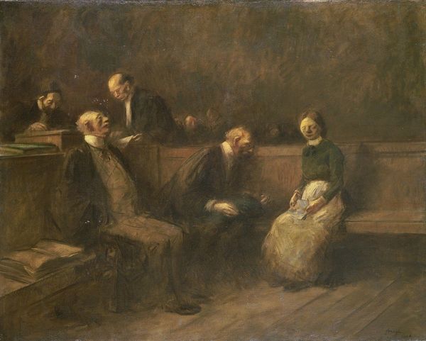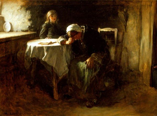 Editor: So, this is "The Potato Eaters," an oil painting by Jozef Israëls. It's interesting how he's used such a dark palette; it almost feels like we’re peering into a shadowy corner of this family's life. What draws your eye when you look at this painting? Curator: That darkness, you nailed it. It's almost tangible, isn't it? Think about that - that choice to shroud them, those bowed heads. This wasn't some accident; it was a deliberate choice. A statement, even. He is painting labor here, not the cute, rosy-cheeked version, but something gritty and primal and… almost holy. Does the shared meal almost look like something else to you? A last supper, maybe? Editor: I see what you mean about the light. It pools around the faces and hands, like a spotlight, but leaving everything else hidden. How do you think that contrast impacts our understanding of the piece? Curator: Precisely. He illuminates not just the physical features, but the *burden*. This is more than dinner, sweetheart; it’s a communion of hardship. This family's labor IS their offering. Consider where he departs from contemporaries like Millet, where labor has that heroic romantic element to it. Israels presents more quiet dignity. Almost somber. Editor: That’s such a powerful perspective. I initially saw just gloominess, but now I appreciate how those dark tones actually underscore the quiet dignity of their lives. Curator: See? And art always holds another layer. This work, it makes me think, if even in darkness we may see something worth cherishing, maybe our view of the light isn't as good as we expect!