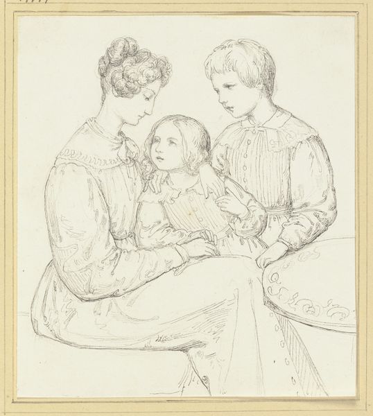 Curator: Jean-Auguste-Dominique Ingres' "The Cosimo Andrea Lazzerini Family," is a striking portrait done in pencil. Ingres, working in the Neoclassical style, creates an intimate glimpse into familial representation. Editor: It’s almost like looking at a faded dream. The delicate lines of the pencil give it this soft, ethereal quality. But something feels a little stiff, too... not entirely at ease. Curator: I think that unease speaks volumes about the performance of class and gender. Ingres’ portrait offers a glimpse into the 19th century’s construction of family and power structures within it. What appears traditional isn't necessarily natural or seamless; there is labor involved. Editor: The ruffles, though! Mountains of them around the woman’s face and cascading down her arms, even on the little girl's bonnet. Do you think that was actually fashionable, or more about flaunting wealth, literally wearing their status? Curator: Absolutely! That exaggerated display served a purpose. Those fabrics would be coded for race and gender. Consider how portraiture served elite families like the Lazzerinis: art could be harnessed to reinforce a specific social narrative about class and wealth. Editor: And what about the little girl? Her positioning feels, well, less like she is part of the portrait and more like an… accessory. Curator: Well, it isn’t uncommon in historical European painting. It reminds me of analyses around the ‘Madonna and child’ depictions in religious paintings of the period— where both motherhood and lineage were put on display. Here, the little girl embodies continuity and legacy, visually emphasizing the patriarchal succession. Editor: It’s fascinating how much social commentary can be packed into a drawing. Seeing it this way adds so many layers. It’s almost like decoding a hidden language. Curator: Ingres’ portrait captures more than just the likenesses of the Lazzerini family; it reflects the prevailing norms and expectations surrounding family, class, and power in its time. I think this invites us to investigate the narratives that are at play within any artwork, regardless of its surface appeal. Editor: Absolutely! The light touch of the pencil captures this sort of ghost-like image of the family—the drawing acts as a reminder about these people from a completely different world and a different set of expectations.