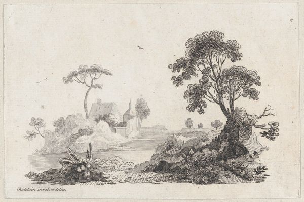Editor: So, this is "River Landscape with Houses along the Shore" by Sébastien Le Clerc, the elder. It's a delicate etching, and I’m struck by how the buildings seem to mirror the natural forms around them. What do you see in this piece? Curator: The architecture, even in its detailed rendering, serves as a container of human narrative. The river, reflecting the sky, mirrors our own subconscious, constantly shifting. Do you find a tension between the rigid structures and the fluid environment? Editor: I do. The figures seem small against the landscape, but also very active. Curator: Precisely! Each figure acts as a distinct symbol within the larger composition. They carry burdens, engage in conversation, and wade through the water. What do these everyday actions suggest to you about the values of the time? Editor: Maybe a connection to labor and the land? I hadn't thought about how each figure contributes to the story. Curator: Visual symbols have power, inviting us to delve into cultural memory. Editor: I see the narrative now. It's all about understanding the symbols within it.