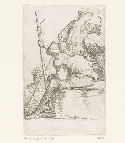Henri François Schaefels created this etching, titled 'Butcher with a cart pulled by two dogs', using etching techniques on paper. The composition is organized around a central grouping of figures and objects, creating a sense of depth within a confined space. The butcher, positioned in the background, peers over a complex arrangement that includes a chair, a cartwheel, and two dogs. The textures, achieved through varying densities of etched lines, range from the smoothness of the butcher's attire to the rougher surfaces of the wooden cart and the dogs' fur. The spatial organization invites us to consider relationships between labor, domesticity and companionship. The detailed rendering of the scene reflects a semiotic system where each element signifies a different aspect of life and work. The butcher's profession is indicated through his placement near what appears to be his equipment, while the dogs could be interpreted as symbols of loyalty or working animals. This etching challenges fixed meanings by presenting a blend of everyday life and symbolic representation, inviting ongoing interpretation of its cultural and philosophical implications.