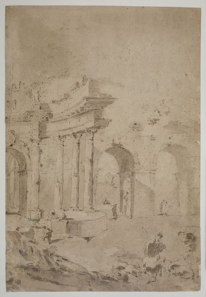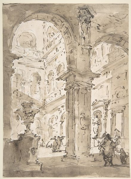 Curator: Welcome to the Metropolitan Museum of Art. Today we're looking at "Architectural Capriccio: Grand Staircase Seen through an Archway," an etching by Francesco Guardi, likely created sometime between 1712 and 1793. Editor: It’s almost dreamlike. The architectural forms seem both solid and transient. The ink-wash feels fluid and slightly unstable. Curator: Indeed. Guardi’s etching demonstrates an interesting tension between representation and imagination, offering us a glimpse into 18th-century Venice, a city undergoing immense social change as well as aesthetic renovations and conservative restorations. How do the figures interact with the constructed landscape? Who were these people? Were they of noble descent or local traders? Editor: Looking at the labor involved is vital. The artist invested meticulous effort into detailing classical motifs and the clothing and accessories that make up the figures present throughout the image. Yet, it's a print. An etching is reproducible. This complicates any aura of preciousness it might initially project. Consider the economy of image-making at the time, especially for prints and etchings. The labor involved with mass-producing images certainly had a role in a greater accessibility to the public and a potentially diverse consumer base. Curator: Precisely! It really opens up discussions of accessibility. Furthermore, think about the power dynamics embedded within the architectural style itself. Grand staircases were markers of status, announcing privilege. To see the mixing of what appears to be a spectrum of the Venetian class structure makes you think about how Venice operated at that moment, perhaps pointing towards some social fluidity or, rather, class tension. Editor: Right, because the architecture in itself – these imposing structures – speaks to power and authority through specific techniques that also serve as indicators of the skill or craftmanship involved. But by recreating architectural features that borrow from both the Byzantine and Roman architectural vocabularies in Venice during its peak in merchant trade, is this Guardi drawing an ironic pastiche about Venice as a major hub in an earlier era of capitalist enterprise? Curator: A powerful point, given that these ‘capricci,’ or architectural fantasies, were often purchased by wealthy tourists. So what does that say about the consumption of an idealized or dramatized Venice and the commodification of such cultural fantasies? Editor: I find myself seeing the work now not only as a demonstration of skillful artistic practices but also a lens through which we see a highly lucrative industry catering to the desires and values of an emergent form of capital. Curator: What an incisive interpretation; that emphasis on the social implications of material processes allows for understanding it as a reflection on Venice as a site of luxury and aspiration. Editor: Precisely. It changes everything we thought we knew.