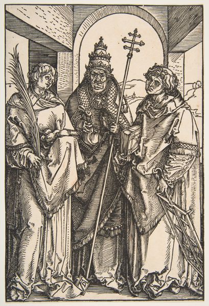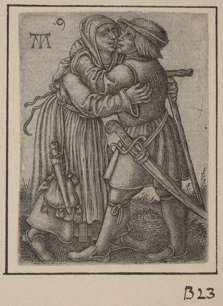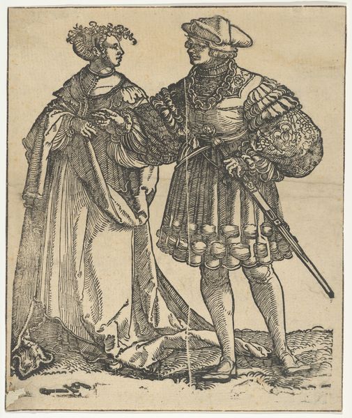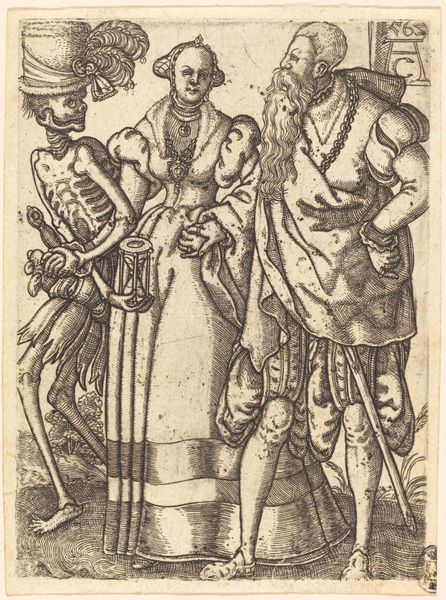 Editor: Here we have Allaert Claesz.'s "Dance of Death III," created around 1562 as a print. It strikes me as incredibly detailed for its size, and the figures are so richly adorned, even Death himself! What can you tell me about this piece? Curator: As a materialist, I am fascinated by the labor and resources required for its production. Consider the engraver meticulously carving the image onto a metal plate, a skill acquired through rigorous training and supported by a complex economic system. The print itself, a multiple, makes art accessible beyond the elite, democratizing, to some extent, the powerful message of the *memento mori.* What do you observe about the subjects' clothing and adornments? Editor: Well, they’re lavish! The man’s feathered hat, the woman’s jewelry, the fine fabrics… they scream wealth and status. Even Death has a cloak. Curator: Exactly. But what does that material excess tell us about 16th-century Dutch society? Wealth, yes, but also a burgeoning mercantile culture and anxieties surrounding earthly possessions. Notice how Death undermines these symbols of status. He's a great leveler, highlighting the ultimate futility of material wealth. How do you see the print functioning as a commodity itself within this context? Editor: I guess it's a paradox. It’s about the transience of earthly things, yet it’s a tangible object someone purchased and kept. So, in a way, it’s also a form of... collecting death? A warning they wanted to keep close? Curator: Precisely! It exposes a culture grappling with both spiritual and material concerns. The print, as a product of skilled labor and trade, embodies this tension perfectly. Editor: I never considered it from that angle! Seeing the labor and the economics behind it really adds another layer of meaning. Curator: Indeed. By focusing on the materials and their circulation, we can unpack a richer understanding of the work’s historical context and its engagement with prevailing societal values.