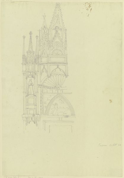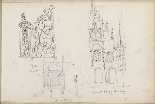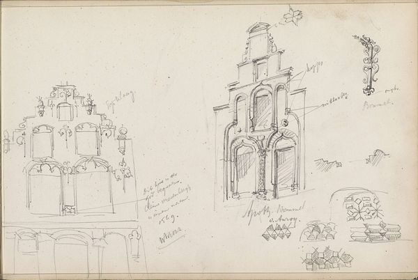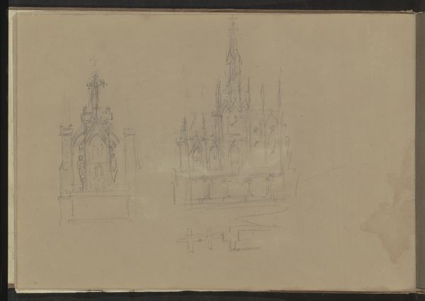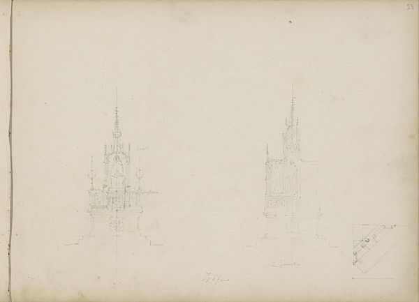 Editor: Here we have Pierre Cuypers' "Zijaltaren, Schijndel" from 1857-1859, a pencil and etching drawing from the Rijksmuseum's collection. It's interesting how fragile and preliminary the drawing looks despite its architectural subject; it’s a sketch, after all! What leaps out at you when you see this work? Curator: Well, isn't it delightful how Cuypers, even in these initial sketches, infuses a sort of airy grandeur? It reminds me of paging through a brilliant architect’s daydream journal. Can’t you almost hear the hammers and chisels in your mind as the altars take shape? He is letting us into his vision, isn't he? I'm especially drawn to the arches hovering over each design... what are they doing? Are they boundaries? A promise? Hmmm. Editor: That’s an interesting point. The arches seem more like guidelines for what could be. Curator: Precisely! He’s not just presenting a design; he's offering possibilities. This reminds me, did you know Cuypers was instrumental in reviving Gothic architecture in the Netherlands? This sketch really breathes that devotion. Tell me, do you get that feeling too, or am I simply seeing what I *want* to see? Editor: I do see that connection now that you mention it. Before, I saw more of a study, but now the arches make me feel that there are some stories that the altars must convey. Curator: Ah, see? We're both interpreting, co-creating its story now, aren't we? Maybe art isn't about concrete answers at all but, rather, asking better questions of what we're viewing. I appreciate Cuypers leaving breadcrumbs for us, generations later, to find our way to the core, or maybe even create something entirely new with his initial offering. What a delicious idea!
