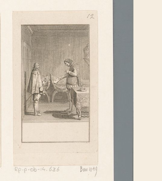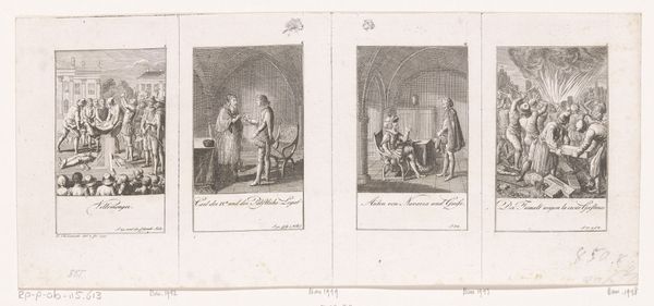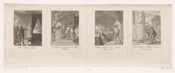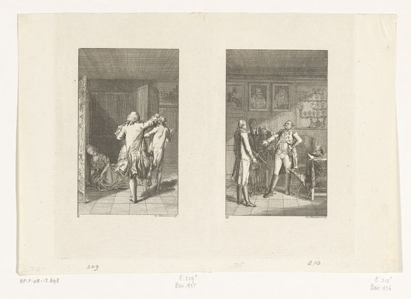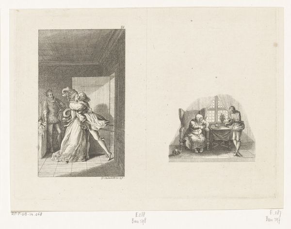 Curator: Here we have Daniel Nikolaus Chodowiecki's engraving from 1779, "Skelet van de minnaar in een vitrinekast en kelk waaruit bloemen groeien"— "Skeleton of the lover in a display case and chalice from which flowers grow." Editor: The two scenes separated on a single sheet create an immediate contrast: claustrophobia versus austere emptiness, complexity against brutal simplicity. Curator: Precisely. Chodowiecki manipulates the composition quite deliberately. Notice how the heavy lines of the architecture in the scene on the right box in the figures, creating an oppressive mood, quite distinct from the adjacent panel. Editor: Yes, but it is the symbolism that captivates me. The skeleton—vanitas, fleeting nature—in a vitrine speaks to doomed, contained romance, like a reliquary. It stands against the potential for growth embodied in the blooming chalice in panel two. It reads almost allegorically, as if depicting love and its transience. Curator: You focus on iconography. What strikes me is how the artist balances tonal contrasts within each scene. Note how, in the left image, a candle is deployed almost theatrically to create dramatic contrasts that direct your gaze, animating otherwise mundane forms with almost baroque flair. Editor: Undoubtedly. Candles carry immense cultural weight—illumination, guidance, but also burning passion. Look at the scene on the right: Two figures meet near what appears to be a tomb—an open box. Perhaps, it evokes something of the artist's contemporary, Piranesi, and his use of shadow and form. Death looms in the visual language of history. Curator: It’s interesting how he manages depth using etching; in particular, with the left panel’s interior perspective which, by using layered etching and shading, conveys both distance and scale masterfully. The arrangement provides, as you suggest, an opportunity to weigh meaning as well as technique. Editor: Ultimately, the engraving provides a thought-provoking glimpse into late eighteenth-century anxieties concerning life and death, love and loss. Curator: I concur, and moreover, highlights Chodowiecki's expertise with manipulating space and form to produce maximum visual effect.