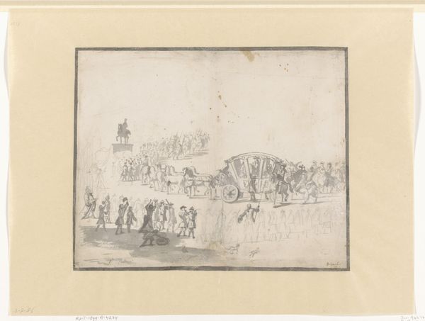 Victor Adam’s print captures the bustling streets of Paris, showcasing two public omnibuses: the ‘Algemene Parijse’ and the ‘Dame Blanche.’ The omnibus, a symbol of modernity, signifies connection and collective movement through the city. Yet, these horse-drawn vehicles remind me of ancient Roman chariots, symbols of power, triumph, and public life. The arch in the background, echoes triumphal arches of antiquity. It speaks of victory and imperial ambition, motifs that have appeared in various guises throughout history. Interestingly, while the Roman arches celebrated military success, here, the arch frames a scene of everyday urban life. This transition reflects a shift from militaristic values to the celebration of progress and accessibility. The arch's presence, deeply embedded in our collective memory, subtly infuses this modern scene with a sense of historical weight. It links the present to the grandeur of the past, a potent reminder of how symbols evolve and endure through time.