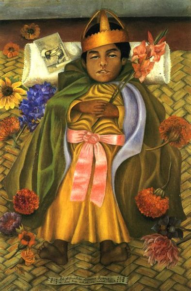 Curator: Here we have Frida Kahlo's striking Self-Portrait Dedicated to Leon Trotsky, painted between the curtains. The depth and richness of the ochre background, against her vibrant attire, immediately draws you in. Editor: Indeed, Kahlo’s intense gaze, framed by those iconic brows, feels like a direct challenge. The way she holds that letter, almost like a shield, and the delicate bouquet, suggest a very personal narrative unfolding. Curator: The symbolism here is potent. The flowers, often a motif of beauty and fragility, are clutched tightly, perhaps hinting at a love or a truth she’s protecting. The paper in her hand, the inscription clearly visible, speaks to a direct, perhaps political or intimate, communication. Editor: And the backdrop of heavy curtains, drawn as if for a private unveiling or a stage performance, adds layers of meaning. Is she presenting herself, or is she concealing something? The political undertones of her relationship with Trotsky are undeniable, yet this portrait feels so deeply personal, almost like a declaration of her inner world. Curator: It's this duality that makes Kahlo's work so enduring—the public persona and the private soul, both laid bare with unflinching honesty. Editor: Absolutely. She uses the visual language of her identity and her surroundings to create a powerful and complex statement.