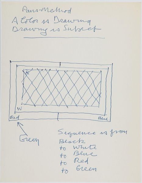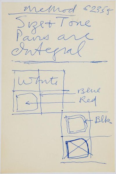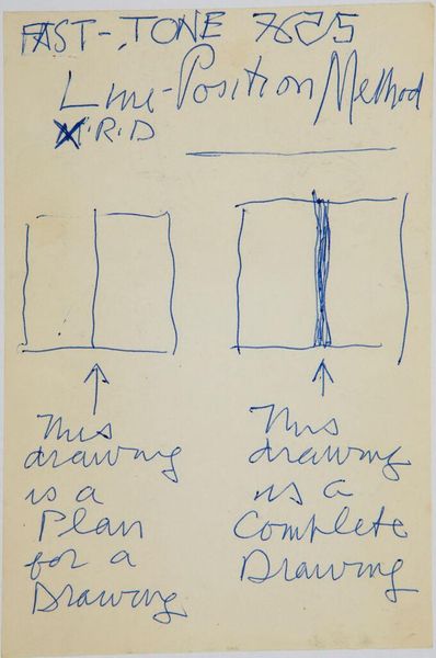 Curator: This is "Art Theory Text with Line Drawings," created by Stuart Davis. Editor: It looks like a quick study, almost a diagram—the stark blue lines are incredibly direct. Curator: Davis’s interest lay in how the commodification and industrialization of culture impacted artistic production. Note how the tools and material itself—pen and paper—speak to accessibility. Editor: Yes, but consider the deliberate placement of those lines, the text framing the compositions. There’s a clear intention to explore the relationships between form and language. Curator: Indeed, his notes suggest a meditation on color, impact, and line. Davis used his drawings to plan and study the basic principles of artmaking. Editor: It’s like a visual manifesto, stripped down to its barest elements. Ultimately, a fascinating glimpse into the artistic process.