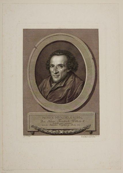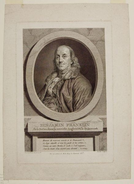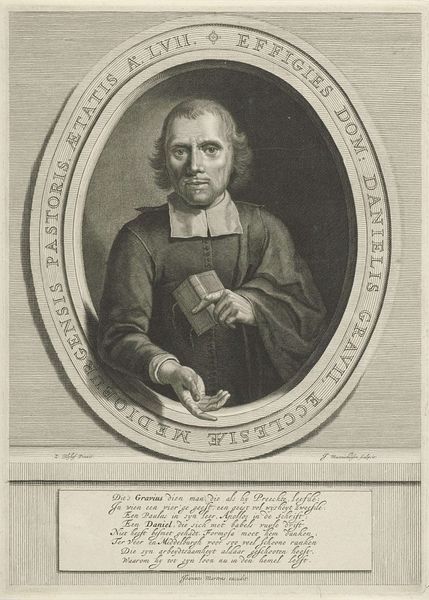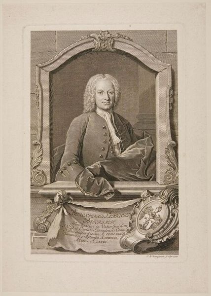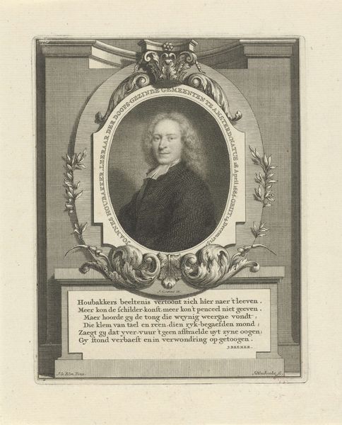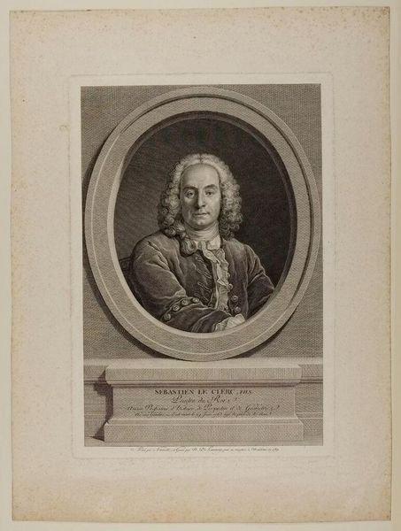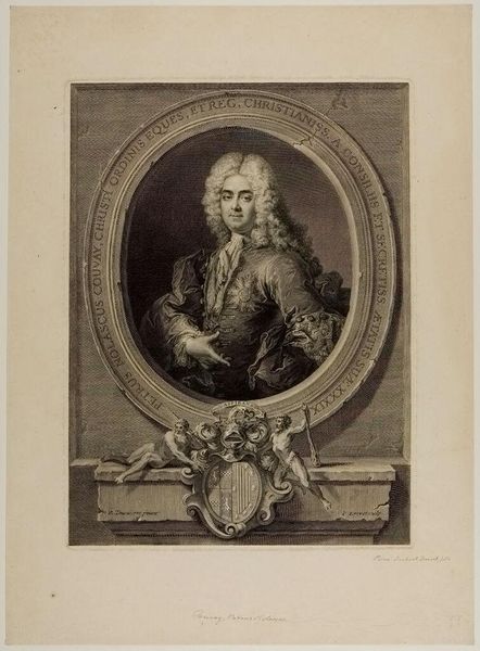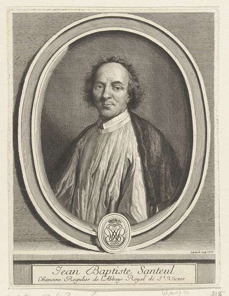 Curator: Here we have Gerard Edelinck's portrait of Jean-Baptiste Santeuil, an engraving that captures the essence of its subject within a detailed oval frame. Editor: It strikes me as a study in contrasts, really. The man's intense gaze versus the almost playful curls of his hair, the crisp lines of the engraving against the soft shadows on his face. Curator: The oval frame itself is quite symbolic. Ovals often represent a sense of enclosure, a world within a world. The medallion below, with its entwined initials, adds another layer of identity, a personal seal almost. Editor: Yes, and it certainly speaks of the time, doesn't it? A period when identity was so closely tied to symbolism and presentation. It's more than just a portrait; it's a statement. Curator: Indeed. Looking at it now, I'm reminded of how even the most carefully constructed images can still reveal something unexpected about the human spirit. Editor: Right, like a coded message from the past, that makes us think about the image's purpose and the way we approach the world.