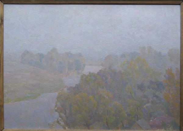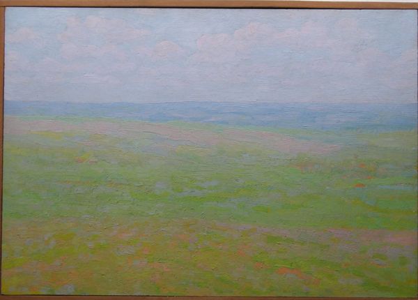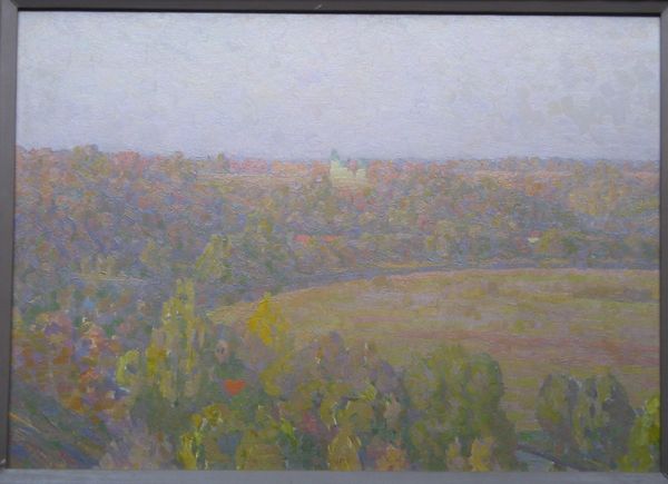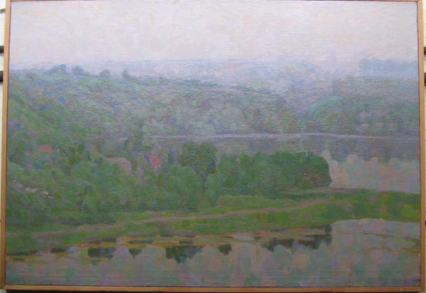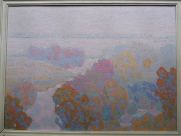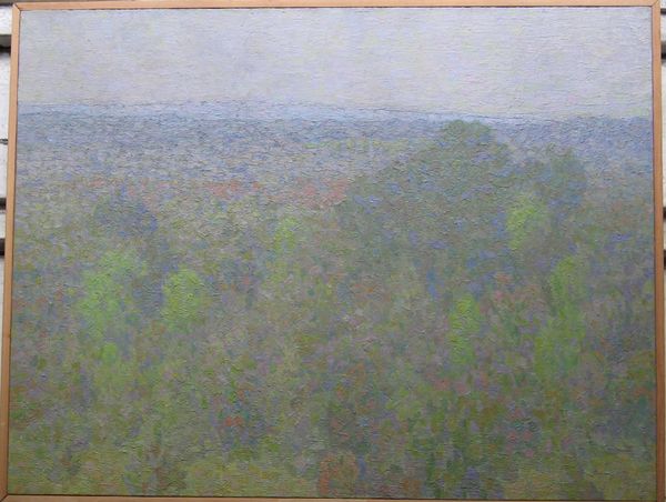 This landscape painting was created by Hryhorii Havrylenko, though the exact date is unknown. It's a study in muted tones and atmospheric perspective. The composition is divided horizontally, with the upper two-thirds depicting a hazy sky and distant land, fading into a soft horizon. In the foreground, the artist uses layered brushstrokes of green, yellow, and brown to define the dense foliage. These strokes create a tactile quality, contrasting with the smoother, blended treatment of the sky and land. The painting's structure invites contemplation on the nature of perception. The soft focus and limited palette reduce detail, emphasizing the overall impression of a landscape rather than a specific place. This aesthetic choice reflects a broader philosophical concern with subjective experience. Havrylenko’s technique invites us to consider how we construct meaning through our senses.