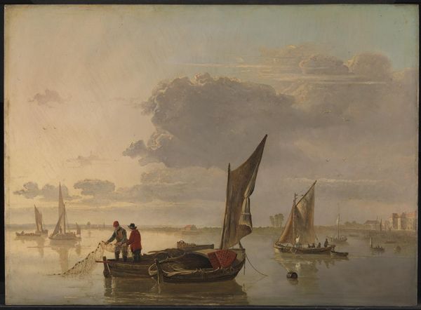 Simon de Vlieger painted this work, Calm Sea, in the 17th century, a period when the Dutch Republic was a major maritime power. The painting evokes a sense of serenity, yet the sea has historically been anything but calm for many. Maritime trade routes were fraught with the brutal realities of colonialism and the exploitation of enslaved peoples. The laborers would have experienced the sea as a site of forced passage and unfathomable loss. De Vlieger, known for his marine paintings, doesn't directly depict these harsher realities, but they subtly haunt his serene seascape. The calm, reflective surface of the water invites contemplation, while the sky, filled with billowing clouds, hints at the unpredictable forces of nature. The painting offers a moment of aesthetic pleasure, but also a reminder of the complex histories that shape our understanding of the world. It allows us to reflect on both the beauty and the burdens carried by the sea.