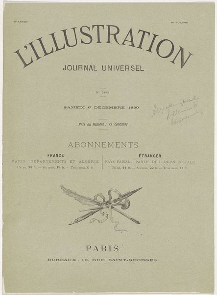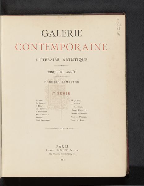 Curator: This typographical print, a poster really, serves as the title page for the "Galerie Contemporaine Artistique: Peintres et Sculpteurs," dating back to 1881. The listing hints to painters and sculptors found inside. What is your immediate response? Editor: Clean, almost austere. The typography's straightforward, yet the title's hierarchy in size and color–black, then red–suggests an underlying tension, perhaps a commentary on the era's artistic hierarchy. It's making a statement, but quietly. Curator: It absolutely speaks to hierarchy and access. “Galerie Contemporaine Artistique” was a periodical. In the context of 1881 Paris, the term "contemporary" must have been contentious! Who decided who and what would be included or excluded and on what basis of "art"? Editor: And who was it for? Look at the publisher's imprint. "Ludovic Baschet, Éditeur." These publishing houses held significant sway, shaping the market, influencing taste, essentially acting as gatekeepers for who got seen and by whom. Curator: Exactly. It’s impossible to look at something like this without thinking about Pierre Bourdieu's concept of cultural capital. These artists being listed are actively trying to accrue and exchange in symbolic capital that is art production, influencing visibility and canonization within art history. The very format of this typography signifies its function. Editor: Yet the typography also promises something democratic: accessibility through the medium of print. It suggests an effort to disseminate contemporary art beyond elite circles, engaging a wider audience. Did the journal actually accomplish that? Curator: It likely made inroads. Remember that printmaking as a medium holds powerful significance, reaching those unable to afford original artwork but desiring to stay relevant amidst social changes and connect with art beyond limitations such as education, money, or class status. This became especially significant as cities such as Paris expanded rapidly during that time period. Editor: Absolutely, but at the same time, it's reinforcing certain power structures simply by who is getting featured. That dual role makes it interesting—both a reflection and an instrument of its time. Curator: Indeed, understanding that dichotomy allows us to move beyond simply admiring its visual style. Editor: It provides valuable insight, urging a comprehensive and multifaceted approach.