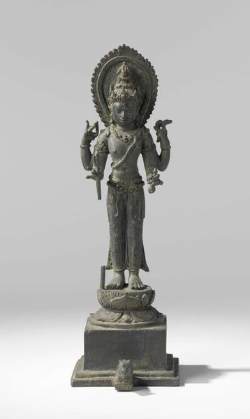 This Standing Buddha was likely made in Southeast Asia, using the lost-wax casting method. Molten bronze was poured into a mold to create the figure. It’s easy to overlook the ingenuity and skill that went into its making, particularly how the maker mastered bronze, a material that can be difficult to control. The figure's balanced posture communicates stability. The bronze adds to this effect with its substantial weight. Look closely, and you’ll notice refined surface details. The face shows a tranquil expression, and the flowing drapery conveys a sense of movement. These details would have required a highly skilled artisan, working within a long tradition of metalworking. The labor and expertise required to create this work are central to its spiritual and aesthetic power. Thinking about this making process helps us to appreciate not only the final object, but the rich context from which it emerged.