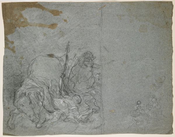 Editor: This drawing, "Upper part of a seated male nude and a father of the church," dates back to the Italian Renaissance, sometime between 1534 and 1566. It's an anonymous drawing on, what looks like, blue paper. The figure on the right especially looks as if it's a rough sketch of a cloaked father, deep in thought. What's your take? Curator: It reminds me of those rare days when inspiration strikes, and ideas pour onto the page in a furious, messy dance! The tentative lines, the ambiguous figures… It’s like glimpsing the artist’s mind at work. It almost doesn't matter whether this was some great master, because here we see an apprenticeship in figuring, the building blocks of Renaissance ideal forms of humanity, being broken back down and reassembled as the creator pleases. Now, what strikes you most about its unfinished state? Editor: Well, seeing those fleeting, sketchy lines, gives me a glimpse of the artist's process, a sense of their thoughts coming to life in real-time, yet their imperfections really stand out, right? Curator: Absolutely! It's vulnerable, isn't it? Think about that, during the High Renaissance where artworks were commissioned, the artist still did have agency of mind. Even a quick, immediate reflection is still preserved today to make us ask these kinds of questions. What stories can *we* give the artist, do you think? Editor: That's a powerful thought! To me, it speaks volumes about the freedom artists had even in more stringent times. Thanks, this gave me a new appreciation for this period. Curator: And you helped me to consider what an artistic 'mistake' could lead to!
