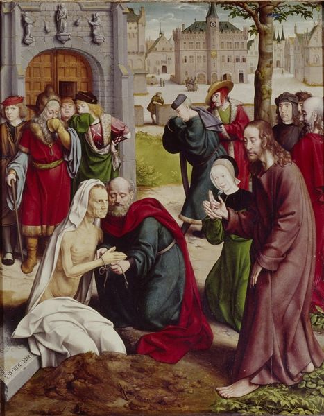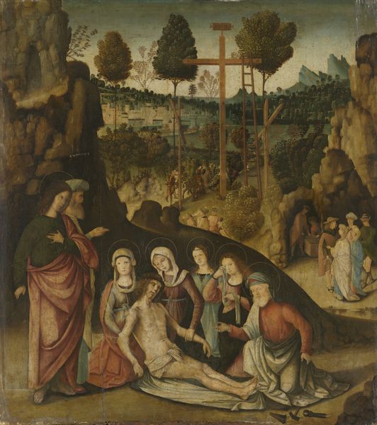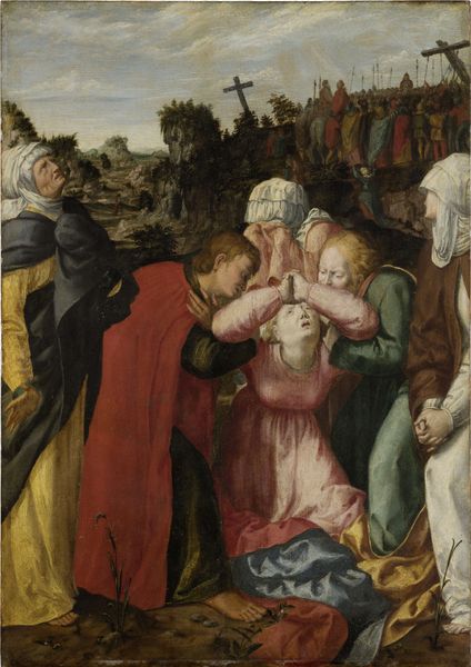 Editor: This is Albrecht Altdorfer's "Christ Taking Leave of His Mother," painted around 1520. The first thing that strikes me is the raw emotion in Mary’s face, almost collapsing under the weight of Christ’s departure. What stands out to you when you look at this piece? Curator: I’m immediately drawn to the construction of gender roles within this historical moment. Look at Mary's passive, grief-stricken state versus Christ's active departure. How does this perpetuate patriarchal narratives, positioning women as emotionally vulnerable and men as agents of action? What is the intersection of divinity, gender and power at play here? Editor: I hadn't thought about it that way. I was mostly focused on the composition itself and the dramatic expressions. It makes me wonder if Altdorfer intended that reading? Curator: Intention is only a fraction of it, isn't it? His society certainly had established expectations for men and women, visible here. But the very act of representing this departure – making the private, maternal grief public – could also be read as a subversive act, pushing the boundaries of acceptable representations of the divine family and asking viewers to engage empathetically with the pain inherent in the patriarchy's designs. Editor: So, you’re saying even within seemingly traditional depictions, we can find elements of resistance? Curator: Precisely. Art isn't created in a vacuum. Examining its social and historical context opens up dialogues about power, identity, and even the potential for subversion. How else could we approach this separation and sacrifice beyond a religious view? Editor: I guess by seeing it through Mary’s perspective as resistance but also acceptance of faith. Curator: Exactly. Thinking intersectionally like this is really crucial in art history. Editor: That makes me see this piece in a completely different light. Thanks!