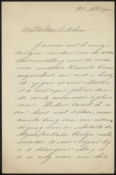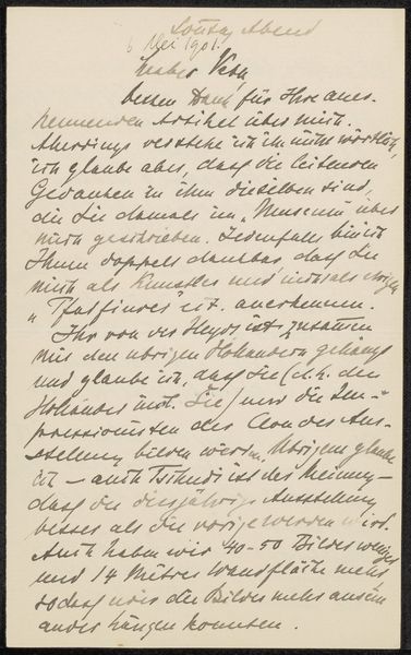 Curator: Here we have "Brief aan Anna Dorothea Dirks en Jan Veth," or "Letter to Anna Dorothea Dirks and Jan Veth." It’s believed to be made sometime between 1895 and 1899, a delicate drawing in ink on paper by Jacoba Cornelia Jolles-Singels. Editor: You know, looking at this, I immediately feel this odd mix of intimacy and distance. The handwriting is so personal, but it's... well, let’s be honest, I can barely make out a word! It feels like eavesdropping on a conversation meant for someone else's eyes. Curator: That's a keen observation. These personal letters, especially drafts and sketches like this one, give us an incredible window into the artist’s life and social circles. These are people who were a part of her intimate sphere and this, no doubt, represents everyday life, perhaps even with its small urgencies. Editor: Right, like the shopping lists of the 19th century! Except instead of groceries, it’s filled with… what, inside jokes and family matters? It's funny how something so specific can still resonate. And that elegant script, it is amazing that she used ink for this sketch; it elevates even mundane correspondence into something beautiful. You know? You can see Jacoba thinking her thoughts. Curator: Exactly! The act of handwriting itself was an art form. This is a great reminder to stop and think about letter-writing traditions now relegated mostly to history, traditions that defined social dynamics and familial bonds in the Netherlands during that era. I also think her use of ink provides permanence. She expects her notes to be looked at after being left somewhere: in a bag, a drawer... who knows? But there it remains today, telling us so many things. Editor: Well, I think Jacoba knew what she was doing. This glimpse into someone's everyday existence—those little, almost secret words scrawled across paper, becomes something bigger, doesn't it? Almost a portrait of the soul… That makes the artwork valuable, I guess. Curator: Precisely! It reminds us that history isn't just grand events and public figures, but the quiet, everyday moments too. Thanks for pointing that out! Editor: My pleasure. There’s just something magical about seeing a letter—like touching someone’s memories and secrets, across time! It seems to remind us how much can be in so little.