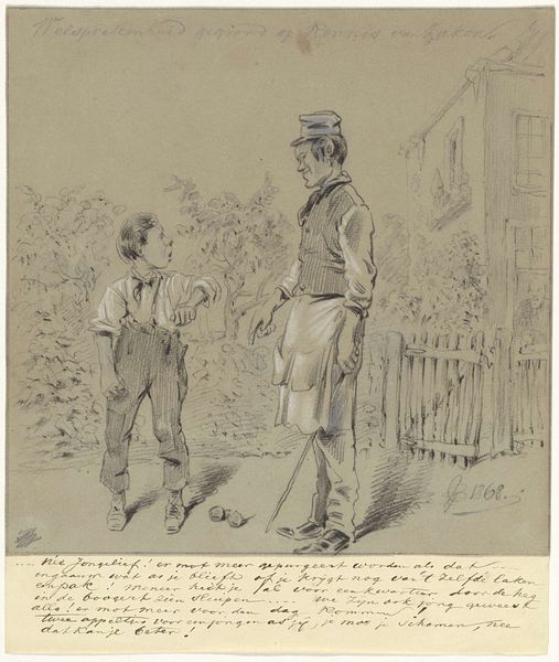 Pieter van Loon rendered this artwork titled "Onderwijzer met leerling bij vader" with pen in 1867. Here, the motif of authority is complex: we have the father, the schoolmaster, and the student, each representing a different aspect of power. The book, typically a symbol of knowledge, is notably absent, suggesting a tension between traditional learning and perhaps a more hands-on approach. Consider how similar scenes play out across various eras. Think of classical depictions of mentorship, where the wise elder imparts knowledge directly, compared to this more rigid, hierarchical setup. The drooping posture of the elder suggests resignation, perhaps indicative of broader societal shifts. This melancholic tone is not new. In Renaissance art, we see similar gestures conveying deep thought or sorrow. The cycle continues, and these symbols persist, continually reshaped by the shifting sands of time.