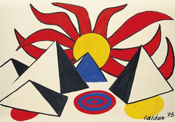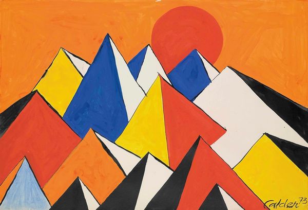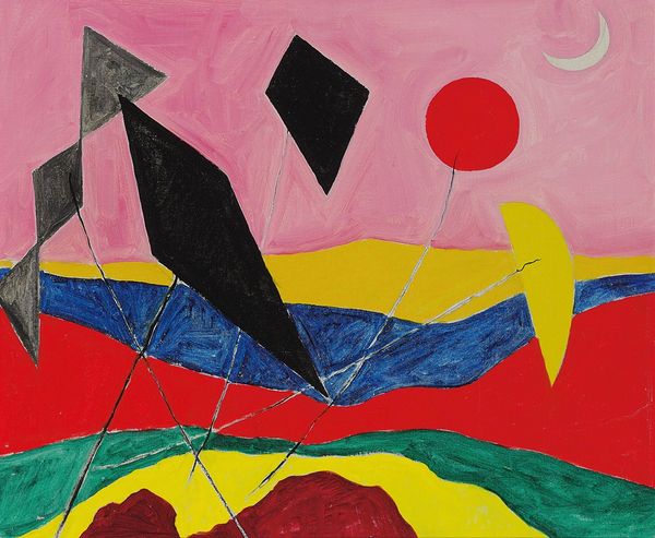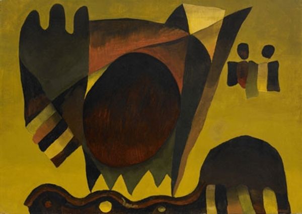 Editor: This is Karl Benjamin’s "Yellow Landscape," created in 1953 using acrylic paint. It strikes me as an unconventional landscape – very flat, very geometric. What do you see in this piece? Curator: Well, immediately I’m drawn to the sociopolitical context of post-war America. The hard edges and bold colors could be seen as a reaction against the more fluid, expressive styles that preceded it. Perhaps Benjamin is using this flattened perspective to critique traditional representations of nature and the idealized landscapes of the past. The sharp angles and distinct color blocks push against notions of natural harmony. Do you see how the title itself, "Yellow Landscape," becomes almost ironic given its blatant artificiality? Editor: I do now. It’s almost like he’s forcing us to reconsider what a landscape even *is*. Curator: Exactly! And think about the use of yellow specifically. Yellow often signifies optimism, but here, juxtaposed with darker shades and stark geometric forms, it feels almost… clinical. I see this painting in conversation with debates around suburbanization and the taming of nature. Editor: That’s a fascinating connection I hadn’t considered. It really pushes you to consider the tension between our idea of “nature” and the way we’re shaping the world around us. So is it about control? Curator: Partly, perhaps. It might reflect anxieties around that control, and the simplification, even the erasure, of the natural world under modern development. It poses uncomfortable questions about the choices we make in altering the landscapes we inhabit. Do you think that adds new resonance when we view the painting today? Editor: Definitely. I'm looking at it completely differently now. The painting seemed cheerful at first, but now it has an edge. Curator: And hopefully, by extension, allows us to recognize the complexities behind what looks like even the simplest of landscapes around us. Editor: It's amazing how much context changes the viewing experience. I’ll remember to ask questions beyond the surface when I'm looking at other artworks, too.
