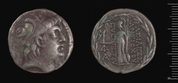 Editor: This is a Tetradrachm of Antiochos VIII and Cleopatra. What strikes me is how the two faces seem almost melded together. What do you see in this piece? Curator: Coins such as this one become potent symbols, not just of rulers, but of complex relationships. The conjoined portraits speak to a dynasty, but also to the power dynamics inherent in a royal marriage. What visual cues tell us about their roles? Editor: I guess the way they are presented together suggests unity, but also potentially hints at hidden tensions, like a power struggle? Curator: Precisely! Consider how cultural memory might have shaped the understanding of such imagery. What stories were circulating, and how did this image reinforce or challenge them? Editor: It's fascinating to think how much meaning could be packed into such a small object. Curator: Indeed. It's a reminder that even the most mundane objects can carry significant emotional and political weight.