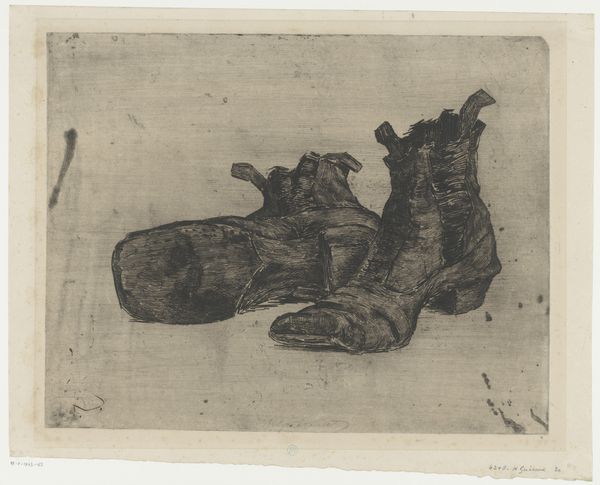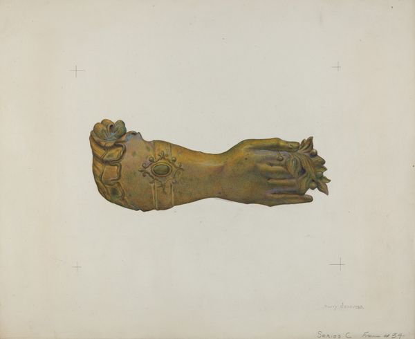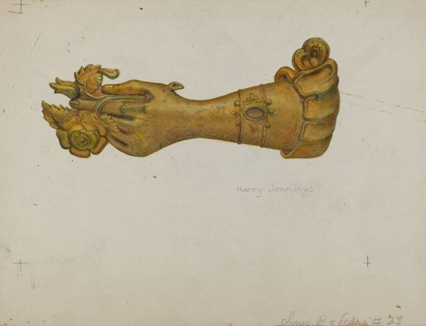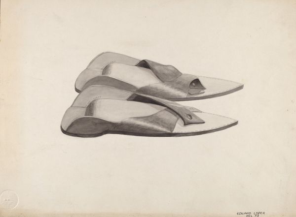 Editor: Here we have Frank McEntee’s "Ladies' Slippers," a watercolor painting from around 1939. They look like they’ve seen some wear. What stands out to you in this unassuming image? Curator: I see a deep engagement with the materiality of the slippers themselves. Note the textures—the worn leather rendered in subtle washes of watercolor, and the hint of the lining peeking out. How do the processes of making the slippers themselves and the painting of them speak to one another? Editor: That's interesting, I hadn't thought about the parallel. Could you elaborate? Curator: The slippers, mass-produced objects in their time, involved a specific division of labor. The painting, conversely, appears to be the product of a single artist's hand. Doesn't this contrast highlight the complex relationship between art, craft, and industrial production in the 1930s? We should consider who made them and where? What were the social implications of owning such items? Editor: So, it’s not just a pretty still life; it's also commenting on labor and consumerism? Curator: Precisely! The very act of choosing these ordinary objects, depicting them with such care and detail in watercolor, elevates them to something more than mere footwear. McEntee is directing us to observe the societal structures that defined their value. Editor: I guess I hadn’t considered that. Thank you, looking at art through the lens of material and production gives a completely new viewpoint. Curator: It certainly challenges us to think beyond the surface, encouraging us to ask critical questions about the making and consumption of everything around us.