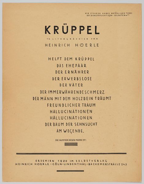 This is the title page of the portfolio 'Krüppel' – 'Cripples' – a series of lithographs by Heinrich Hoerle, published in 1920. The stark typography itself becomes a symbol, evoking the fragmented and broken state of post-war German society. The capitalized word 'Krüppel' immediately brings to mind the wounded soldiers returning from the war. The list below speaks of the 'everlasting pain', the 'man with the wooden leg,' the 'unemployed'. These figures are not merely physical representations of suffering; they embody a collective trauma, a psychological wound inflicted upon an entire generation. The 'tree of longing' suggests a subconscious desire for healing, a return to wholeness. Yet, this hope is juxtaposed with 'hallucinations', hinting at the distorted reality experienced by those scarred by war. The cyclical nature of trauma, passed down through generations, finds its visual echo in the recurring motifs of suffering throughout art history. This is not just a depiction of cripples; it's a mirror reflecting the fractured psyche of a nation.
