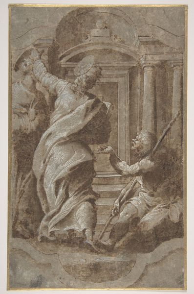 Editor: Here we have Antonio da Trento's engraving, "Augustus and the Tiburtine Sibyl," created sometime between 1500 and 1550. The ochre tones give it an aged feeling, like a memory. What symbolic language jumps out at you? Curator: Well, the composition itself is fascinating. We have Augustus, a Roman Emperor, being shown a vision of the Virgin and Child by the Sibyl, a prophetess. Notice how Augustus is presented— almost hesitant, needing to be ushered forward. Editor: Yes! He looks…reluctant. What could that symbolize? Curator: Think about it. Augustus, a figure of immense power in the Roman world, is being shown a future that supersedes his own. It's the dawn of Christianity eclipsing the Roman Empire. This humility is not just personal; it speaks to a larger shift in cultural power. The clouds, framing what's coming, act almost as a stage for this important moment. Editor: The Roman architecture crumbling in the background underscores that, right? Like the old order is fading? Curator: Exactly! And see how the Sibyl is positioned, hand raised, mediating between these worlds. She embodies the bridge between pagan prophecy and Christian revelation. Editor: It’s incredible how much narrative is packed into one image, and how the artist uses composition and symbolism to convey such a complex message about the transition of power and belief! I’ll definitely be looking for similar visual cues in other Renaissance works now. Curator: Indeed! Images like this remind us that art serves as a potent carrier of cultural memory, constantly reshaping how we understand our past and anticipate our future.