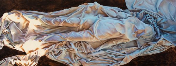 Aaron Nagel’s painting, "Collision," presents a mesmerizing arrangement of draped fabric. The eye is immediately drawn to the contrasting cool blues and warm golds that play across the folds, creating a dynamic push and pull. The artist's meticulous attention to the way light reflects off the material gives the fabric a palpable sense of depth. This isn’t merely a study in realism; the composition seems to delve into broader ideas about form and fluidity. The way Nagel captures the material, almost as if it’s in motion, evokes the way cloth has been used in the history of art to conceal or reveal aspects of the human form. The fabric's interaction with light and shadow becomes a metaphor for the constant changes we experience. The fluid, almost liquid appearance of the fabric suggests a kind of existential flux, making us consider how surfaces can distort and transform our perceptions. This invites endless interpretations, making the artwork a source of contemplation and intrigue.