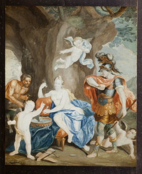 Gabriel de Saint-Aubin made this allegory using delicate applications of watercolor and gouache on paper. The translucent quality of watercolor allowed Saint-Aubin to build up layers of luminous color, while the use of gouache provides opacity and texture, particularly visible in the drapery and the figures' skin. The artwork's visual impact is influenced by the artist's choice of materials, where the fluid, ethereal nature of the watercolor contributes to the dreamlike quality. Saint-Aubin's technique involves skilled handwork, using fine brushes to create precise details and subtle gradations of tone, while the combination of watercolor and gouache demands a mastery of both mediums. Looking closely, the labor of the hand is evident in every stroke, reminding us of the artist's role in bringing allegorical concepts to life through meticulous craft. By highlighting the material qualities of the work, we recognize Saint-Aubin's skill and imagination, dissolving boundaries between fine art and craft.