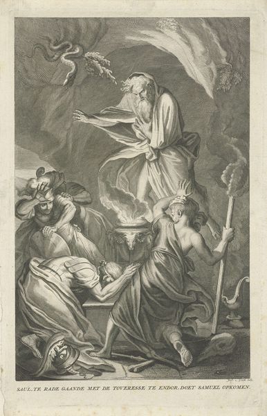 Editor: This is Francesco Villamena's "Boetvaardige Maria Magdalena," an engraving from around 1576 to 1624. There's such drama in the composition; Mary Magdalene is kneeling in what appears to be a rocky wilderness. What strikes me is how she’s framed not only by the natural landscape but also by symbols of mortality and devotion. What do you see in this piece? Curator: For me, this engraving powerfully visualizes the complexities of repentance and redemption within a patriarchal system. Look closely at the gaze, averted, internal. Consider the implications of portraying a woman, especially one historically sexualized, seeking atonement within such a rigid moral framework. Is this truly about spiritual awakening, or is it a performance dictated by societal expectations, an inscription within a narrative of female sin and expiation? What power structures are being reinforced here? Editor: That’s a really interesting point. I hadn’t considered the performative aspect of her repentance. It feels so genuine at first glance. Curator: And the wilderness itself – is it a place of refuge, or a space of imposed exile? The iconography is interesting. The skull, the crucifix, they speak to themes of mortality and salvation, certainly. But let's think about the angel, hovering, presenting her with what seems to be a victor's wreath. What are they celebrating, exactly? Is it absolution or subjugation? Editor: I suppose I never thought of it as subjugation, but it makes sense given the time period. I guess there are multiple valid interpretations. Thank you for highlighting this complexity! Curator: It's a dialogue, right? Between the artwork, the artist, the historical context, and, crucially, our own perspectives. Each informs the other. And remember, there's always room to re-evaluate, to question, to challenge established narratives.
