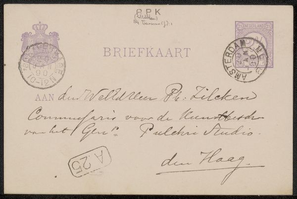 This is a postcard to Jan Veth, made with ink, and sent by Karel Johan Lodewijk Alberdingk Thijm. The script is so graceful, it makes me think about how we communicate with each other. There are these lovely dark and light areas, the contrast really makes the words jump out. I’m drawn to the word “Bussum” stamped at the top, it makes me think of how the artist was marking the paper with these deliberate stamps. And, the way the artist writes out the address, with all those elegant swirls, feels like a performance. It reminds me of Cy Twombly’s works, in how the gestures become the art itself. The materiality of the card, the paper, the ink, they all come together to tell a story, not just of a message sent, but of a moment in time, captured in the simple act of writing. It’s a conversation between two people, but it’s also a conversation between us and the past.