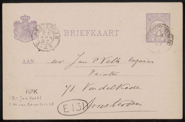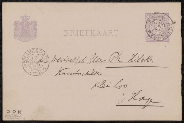 Editor: This is "Briefkaart aan Jan Veth" by Jac van Looij, made before 1897. It's ink on paper, a humble postcard, but the handwriting is so elegant. What catches your eye about this piece? Curator: As a materialist, I'm drawn to the physical qualities first. This isn’t just about personal correspondence, but about systems of exchange, and class. How do the limitations of the physical card shape the message? Editor: That's an interesting question. I hadn’t thought about the format restricting the message itself. It seems informal, certainly. Curator: Exactly. Consider the postal system of the time. This postcard reveals the accessibility of communication, blurring lines between personal and public realms. Is this "art" or simply a means to an end? It is handmade, using the skill of calligraphy; is there a hierarchical difference between a painting and such a missive? What do you think? Editor: It's interesting how the artistry of the lettering elevates a mundane object. So the medium itself - ink, paper, the postal service - influences our interpretation? Curator: Precisely! We're seeing art operating within a material and social framework. The constraints – size, the postal regulations – helped define its purpose, and I would argue, also affected how we perceive the handwritten aesthetic on such a practical thing. Editor: I see your point. The simplicity makes it more relatable somehow. I never thought about how materials dictated artistic expression and affected societal dynamics in this way before. Curator: And now? How would you interpret its material meaning now, knowing this? Editor: I think it adds another layer of complexity and interest to the work – more than just the surface aesthetics. Thanks!
