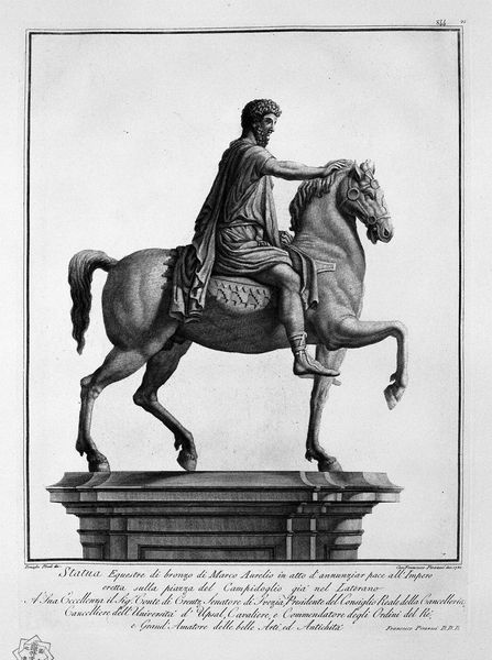 Editor: Right, next up we have Jacques François Joseph Saly's marble sculpture, "Frederik V on Horseback," a sketch from 1758 for the equestrian statue in Amalienborg Palace Square. There's a powerful stillness about it, a sense of controlled energy ready to be unleashed. How would you interpret this work? Curator: It whispers of power, doesn't it? But not just any power – divinely ordained, absolute authority made flesh, or rather, stone! This is Baroque swagger distilled, a deliberate harkening back to Roman emperors. Saly is presenting Frederik as this wise, strong leader in the classical style – but is it all just pomp, or is there something more there? Look at the horse's pose, the rider’s almost casual grip on what appears to be a short, thick, broken sword...it seems rather symbolic of something about his reign and the times... wouldn't you agree? Editor: Now that you mention the broken sword, I initially interpreted it as a simple riding crop, which made the image appear benign. But there’s an intentionality to its stubby appearance...It hints at restraint, perhaps? Curator: Precisely! Or the futility of war. Or perhaps that peace and prosperity can only truly be achieved after a long and difficult fight. So what seems like simple flattery at first glance actually invites us to ponder the complexities of power and its responsibilities. What did you glean about royal power after taking a closer look at the symbolism? Editor: That's fascinating! I guess I was initially swept away by the overall impression of grandeur and missed some of the nuances. Royal portraits aren't as simple as one might think, huh? I appreciate your interpretation! Curator: Exactly! A good piece of art always reveals itself slowly and encourages close, slow looking, revealing something different each time!