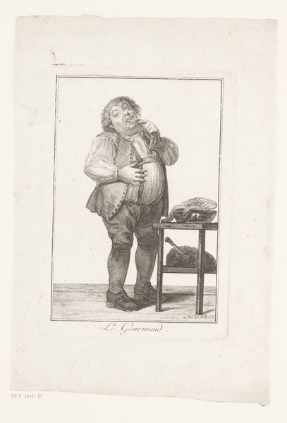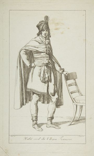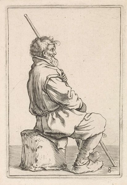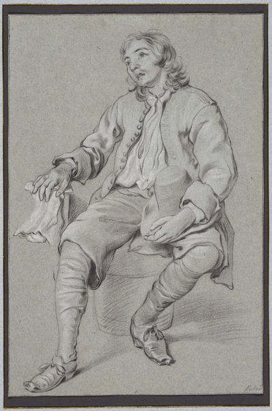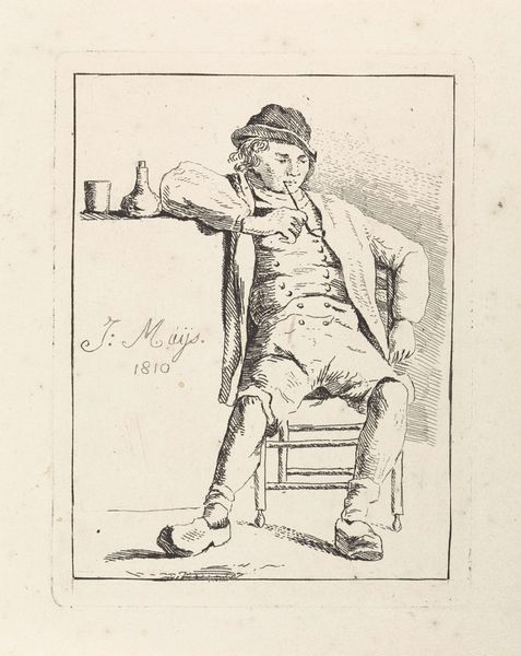 Anthonie Willem Hendrik Nolthenius de Man created this print of a man on a chair around 1828. During the early 19th century, the Netherlands was experiencing a period of economic and social change following the Napoleonic era, reflected in art through increased realism and focus on everyday life. Here, the sitter, casually posed, is depicted with an eye for the details of his clothing and demeanor. His attire, while not overtly opulent, suggests a certain social class, while the relaxed posture hints at a sense of ease or perhaps even boredom. This work may speak to issues of identity and representation, prompting us to consider how individuals from various social strata were perceived and portrayed during this time. The print invites a moment of reflection on the quiet, often overlooked aspects of human existence and also prompts questions about how we represent ourselves and others in art, especially when it comes to social identity.