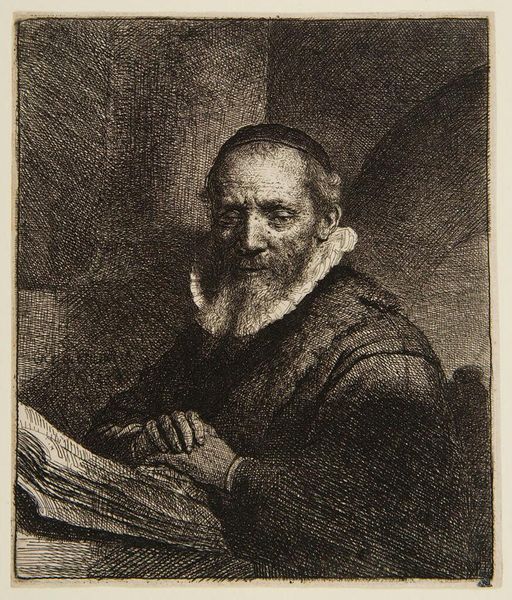 Rembrandt van Rijn created this print of Jan Cornelius Sylvius using etching and drypoint. Portraits in 17th century Netherlands served as important markers of identity and status. Sylvius, a professor of theology and a prominent religious figure, would have been keen to project an image of piety and intellectual authority. Rembrandt, however, presents a more intimate and human portrayal. Consider the somber mood and the subject’s direct gaze. The open book suggests knowledge and learning but also invites contemplation. Sylvius’s hands, clasped together, convey a sense of pensiveness. Rembrandt’s masterful use of light and shadow creates a powerful sense of depth, lending the print a palpable emotional weight. Through this etching Rembrandt invites us to consider not only the public persona of Jan Cornelius Sylvius, but also the inner world of a man grappling with faith and mortality.