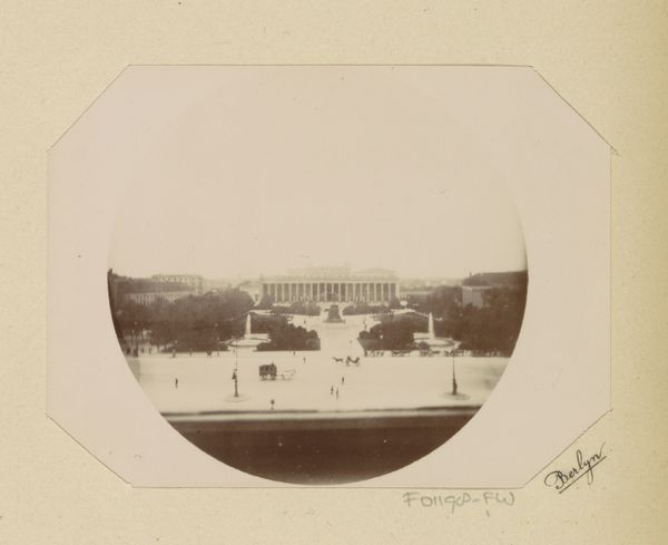 Curator: Oh, wow. It’s like stepping back in time. There's something deeply melancholic about this sepia-toned scene. Editor: Precisely! This albumen print, captured sometime between 1868 and 1880 by the firm M. Frankenstein & Co., offers us a “Gezicht op paleis Schönbrunn, Wenen” or "View of Schönbrunn Palace, Vienna." The landscape is carefully constructed. Curator: Constructed is right. It feels very ordered, very...controlled. The geometric gardens, the rigid lines of trees leading the eye right to the palace, perched so prominently... There's a sense of almost oppressive grandeur, you know? Like a perfect dollhouse someone is about to burn down. Editor: Absolutely. This photograph comes at a pivotal time in Austrian history. The Habsburg empire was attempting to visually reassert itself. The perfect composition you’re responding to signifies power. A very manicured demonstration of the Emperor’s dominion during a period of decline. Curator: Ah, that’s the historical weight of it! Because otherwise, if you take away the context, it’s all light and shapes and textures that are lovely to look at. Almost a little romantic in the way the distance fades into a hazy glow. Editor: The photographic technique itself, the albumen print, would've been quite innovative then. It allowed for sharper details than earlier processes. You can almost see the faces looking back at us in the tiny windows, if we had a large magnifying glass. This precision serves the overarching message: that the empire sees all. Curator: Spooky! Makes the manicured lawns seem less romantic, more like...a trap. That clinical realism serving some political agenda. Editor: In a way, yes. The cityscape becomes a stage for the projection of imperial might, accessible now through this mass-produced photographic image. The reproducibility transforms what was once a unique royal view, turning into something consumed on postcards. Curator: So, it's propaganda wrapped in beauty, served on a photographic plate. Makes you wonder what narratives we are consuming without realising. Editor: Indeed. The image once helped the emperor bolster an image of control; today, it prompts us to think critically about the mechanisms of power and perception that even photographs like this hold.