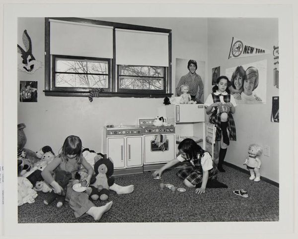 Curator: Marion Post Wolcott's "Children of Coal Miner, Charleston, West Virginia" presents us with a stark image. The photographic print invites immediate consideration of its subjects and setting. Editor: The mood is somber, almost haunting. Those children amid the patterned wallpaper... It's unsettling. Curator: Indeed. Note the contrast—the children's worn clothes against the playful imagery of the wallpaper. The artist frames them deliberately, highlighting these textures and the interplay of light and shadow. Editor: The wallpaper, a collage of cereal boxes, speaks volumes about aspiration and perhaps a failed promise of the American dream. Consumer culture juxtaposed with poverty. The children are symbols of resilience but also of vulnerability. Curator: Precisely. Wolcott uses the formal elements to underscore a particular socio-economic reality. It’s a study in contrasts, isn't it? Editor: Absolutely. It's a powerful, if disheartening, commentary. One can't help but reflect on the stories behind those young faces.