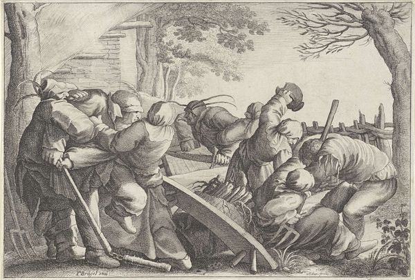 Curator: Let’s dive in, shall we? Editor: This is "The Prodigal Son Driven from the Brothel," a 1658 pen and ink sketch. The scene looks chaotic. What’s going on here, exactly? How do you interpret this work, especially concerning themes of morality and exclusion of women? Curator: Exactly! What we're seeing here is, on the surface, a literal expulsion, but on a deeper level, it represents the societal forces at play. The "prodigal son," likely flush with fleeting wealth, is cast out not just from the brothel, but from a space where certain social contracts are implicitly understood. Think about the women, though. Who is driving this "moral" cleansing and whose values are centered here? Editor: So, the expulsion isn't just a simple morality tale? Curator: Not at all. The scene highlights a specific power dynamic. Men dictate the terms, even in spaces deemed transgressive. Note the musical accompaniment on the right, underscoring the performative nature of this shaming, while the raised broomsticks imply not justice, but a spectacle of exclusion and judgment of gendered morality. It’s less about repentance, and more about control. What does the marginalisation say about gender dynamics of the period? Editor: It highlights how women were so easily othered and how the entire situation reflects male power structures, not a moment of true reflection for the son. It definitely makes you rethink traditional interpretations. Curator: Precisely. And those power structures are worth excavating and questioning. It urges us to consider the narratives we inherit and whose voices are silenced in their telling. Editor: It's unsettling to realize that these kinds of judgmental exclusions still resonate today. Curator: Yes. By looking critically at these seemingly old tales, we might become more aware of similar exclusions in contemporary society and who gets to dictate the norms. Editor: Thanks. I’m going to keep that in mind for my paper!
