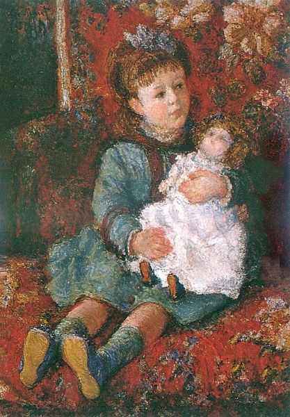 Editor: Here we have Mary Cassatt's oil painting, "Susan Comforting the Baby (no.1)," created in 1881. I'm really drawn to the intimacy captured, almost a fleeting moment of tenderness. How do you interpret this work through its form and materiality? Curator: Note how Cassatt manipulates light and shadow, building form and depth? The loose brushstrokes, especially in the background, are integral to the painting’s aesthetic. Consider also the composition: the close proximity of the two figures emphasizes their bond. The flattening effect of Impressionism also lends an almost timeless quality. Does this observation affect your sense of the moment that Cassatt depicted? Editor: It does! The intimacy feels heightened. The slightly blurred edges really bring a sensory focus to the moment between the two figures, while creating a dreamy aura around it, as if recalling something fleeting or a faint memory. Do you see a kind of message being conveyed in its materiality? Curator: Absolutely. Oil paint, with its ability to create both texture and luminosity, enables Cassatt to render skin tones with remarkable nuance. The way she layers brushstrokes adds a palpable sense of volume and weight to the figures. Notice also the color choices: how do the blues and whites of the baby’s dress play against the warmer tones of the skin and hair? The use of such contrasting values accentuates their tactile differences. Editor: Now that you mention it, that contrast draws my eyes, but then returns to the harmony, so delicate in the portrayal. Thank you! It's made me think about how Cassatt's choices about the formal properties amplify that initial emotional impact, as you described it. Curator: Indeed, a painting speaks, but its voice becomes clearer with the right tools of engagement!