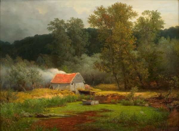 This landscape with a farmhouse and a torrent was created by Andreas Achenbach using oil paints and brushes. Looking at the image, what strikes me most is how Achenbach has applied the paint, mimicking the textures of the natural world. The rough brushstrokes used to depict the farmhouse and the torrent's rushing water give a real sense of dynamism. You can almost feel the cool spray. The attention to detail, particularly in the depiction of the thatched roof and the woman doing laundry, suggests a deep understanding of rural life and labor. These weren't just idyllic scenes, they were reflections of the everyday realities of people working the land. The work involved in laundry is considerable: washing, wringing, and drying. Achenbach, while celebrated as a fine artist, also demonstrates a craftsman's eye for capturing the materiality of his surroundings. Appreciating the work involved, and his attention to detail and texture, allows us to see the significance in what might appear to be just a picturesque view.