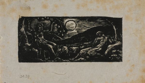 Editor: This wood engraving, "Thenot and Colinet Converse Seated between Two Trees" by William Blake, shows a pastoral scene. The stark contrast and small scale give it a feeling of intense intimacy. What can you tell me about it? Curator: Considering Blake’s historical context, the image reflects a romanticized view of rural life, common during the late 18th and early 19th centuries. The idealized figures may speak to a yearning for simpler times amid industrialization. Editor: So, it's not just about the landscape, but also about what the landscape represented? Curator: Precisely. Blake often used pastoral imagery to critique the social and political issues of his time. This scene serves as a commentary on the relationship between humanity and nature. Editor: That adds a whole new layer to my understanding of the piece. Thanks! Curator: My pleasure. It’s fascinating how Blake uses seemingly simple scenes to express complex ideas about society and its values.
