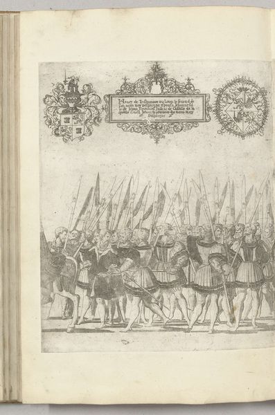 This print, made by Nicolaas Hogenberg around 1500, depicts Bonifatius IV Paleologo and Francesco Maria della Rovere with imperial regalia. It’s made with the intaglio process, where lines are incised into a metal plate, likely copper, and then filled with ink to transfer the image to paper. The technique itself speaks to a moment of transition, as printmaking was becoming a crucial tool for disseminating information and propaganda across Europe. The crisp lines and fine details, achieved through skillful engraving, allowed for the reproduction of intricate designs, making imagery accessible to a wider audience. Consider the labor involved: the meticulous carving of the plate, the careful inking and pressing – each print a testament to the craftsman’s dedication. This reflects the growing importance of skilled artisans in a world increasingly shaped by new forms of production and exchange. In essence, this print encapsulates the intersection of art, craft, and the evolving social landscape of the Renaissance. It reminds us that even seemingly simple objects can reveal complex histories of labor, technology, and cultural exchange, challenging our notions about the boundaries between art and craft.