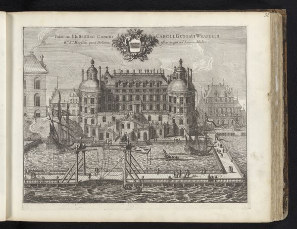 Editor: This is "View of Borgholm Castle from the East" by Willem Swidde, made in 1691. It’s an engraving, and the level of detail is amazing. The castle looks imposing, almost unapproachable. What’s striking to you about this piece? Curator: What interests me is how Swidde’s engraving functions as a form of political communication. Notice how the castle dominates the composition, symbolizing power and stability? Think about the role prints played in the 17th century. They were reproducible, relatively inexpensive, and circulated widely. Editor: So, it’s more than just a pretty picture of a castle? Curator: Exactly. It’s a visual statement. The placement of the coat of arms above the castle further reinforces that connection to authority. Who do you think was the target audience for this print? Editor: Maybe wealthy landowners or nobles, people who would appreciate the image of power? Curator: Possibly, but consider the broader Dutch Republic at the time. There was a rising merchant class with increasing political influence. An image like this could also serve to legitimize authority in their eyes, reminding them of the established order and the protection the castle provides. How does understanding its potential audience shift your perspective? Editor: I hadn’t thought about it that way, focusing instead on just the artistic merits. Seeing it as propaganda makes it much more intriguing. It makes you question what the artist wanted you to believe! Curator: Precisely. It reminds us that art always operates within a specific socio-political context. It serves not just as representation but also as an ideological apparatus. Editor: That's definitely something I'll remember moving forward, that art reflects its environment. Curator: And shapes it too, which I think makes it a rich resource for understanding the past!