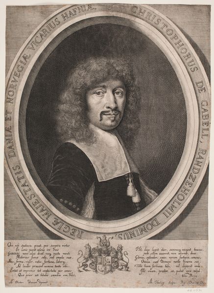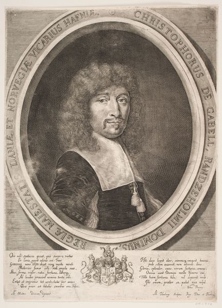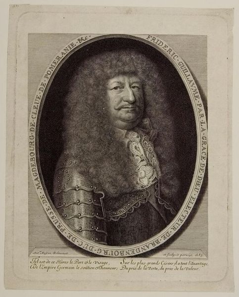 Here we see Jan Frederik Christiaan Reckleben’s portrait of Frederick William, Elector of Brandenburg, rendered with meticulous detail using etching. The composition is stark, dividing the visual field into distinct zones: the portrait bust in the upper section, set against a flat, neutral background, contrasts with the heraldic emblem and inscription below. The oval frame around Frederick William isolates him, emphasizing the meticulous rendering of his features and elaborate wig. The etching technique creates a play of light and shadow, defining textures and contours with remarkable precision. This structured approach invites a semiotic reading. The stark linearity and the ordered layout, combined with the use of heraldry, evoke a sense of authority and the formal conventions of state portraiture. Consider how Reckleben uses the inherent qualities of etching to create this effect; line by line, he articulates not just the likeness of a ruler but also an idea of power, fixed within a framework of representation and cultural meaning.