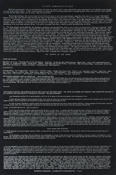 Curator: This intriguing, untitled print is by Sir Eduardo Paolozzi. We don't have a specific date, but Paolozzi was active throughout the latter half of the 20th century. What strikes you initially about it? Editor: It's a dense field of text, almost overwhelming. The blue ground with gold lettering gives it a somewhat formal, institutional feel, yet the scattered phrases hint at something more subversive. It feels like a deconstructed index. Curator: Absolutely. Paolozzi was fascinated with mass production and the accessibility of information. You see how he's lifted phrases from various sources and recontextualized them? There’s text, illustrations, and even an index section. Editor: And the subject matter spans a vast range, touching on history, politics, and popular culture. It's like he’s dissecting language itself, laying bare the cultural narratives embedded within. I see references to fascism and even recipes for revolution. Curator: His method blurs the lines between high art and the everyday. Paolozzi challenges us to question how we assign value and meaning, not just to art, but to all forms of cultural production. Editor: It's a powerful reminder of the social forces shaping our perceptions, a call to actively decipher the messages constantly bombarding us. Curator: A fitting piece to contemplate in our present age of information overload. Editor: Indeed, I'm left pondering the power of language, its ability to both liberate and constrain.