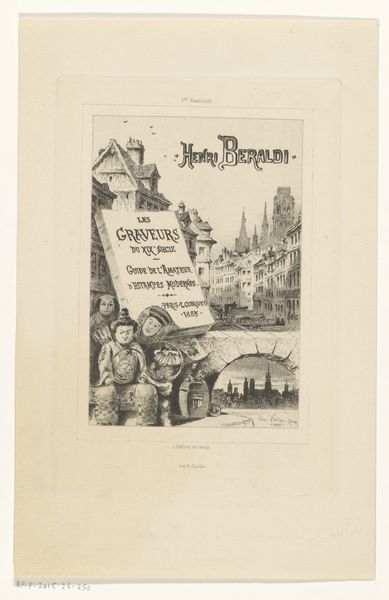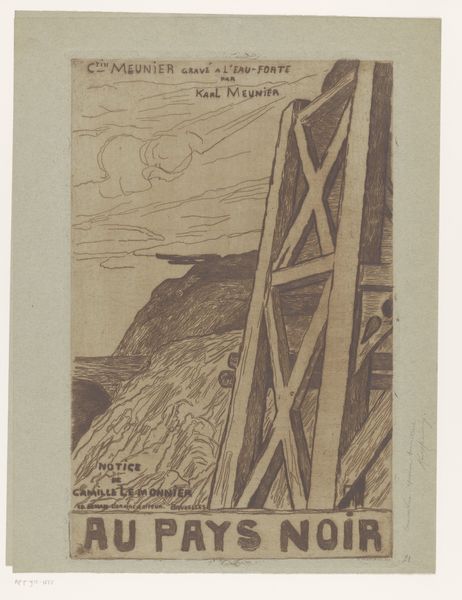 Editor: Here we have "Portret van Maxime Maufra tekenend op een rots," a lithograph and etching poster made in 1894 by Eugène Delâtre. It strikes me as incredibly evocative. The artist in the image looks so pensive amidst the powerful Breton landscape. What grabs your attention? Curator: Well, darling, this piece hums with a delicious kind of fin-de-siècle ennui. It’s got that melancholy, sea-air scented feeling of watching time slip through your fingers, you know? Notice how Delâtre frames Maufra, the artist within the art, perched precariously on that rock? The restless sea swirling around him isn’t just decorative; it's whispering about the untamed, chaotic nature of inspiration. Ever feel like that? Like inspiration could just as easily swallow you whole? Editor: I totally get that feeling! But what's the significance of portraying Maufra specifically? Curator: Ah, there's the juicy bit! Maufra, a landscape painter himself, represents this whole push-and-pull relationship artists have with nature. They are trying to capture it, to tame it on the page, but they can't ever truly control it. It’s like trying to catch a dream in a butterfly net – frustrating, beautiful, and ultimately…fleeting. Isn’t that delicious? Editor: That's a wonderful perspective! It makes me see the waves not just as decorative but as symbolic. I guess the art isn't just about *what* he's drawing, but *how* he's drawing, and how it relates to nature itself! Curator: Precisely! And darling, that’s why this simple poster becomes so much more than just an advertisement. It becomes a tiny meditation on art, nature, and the bittersweet struggle to capture it all. It’s a sea shanty of the soul. Editor: Wow, I'll never look at it the same way again. I will spend some time with those symbolic undertones of taming nature when capturing it on paper. Thanks for all these fantastic insights.
