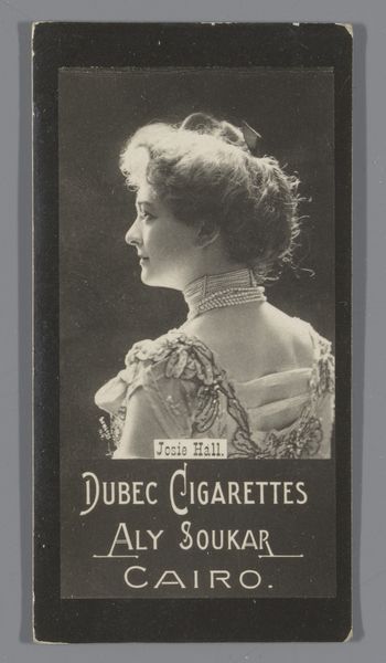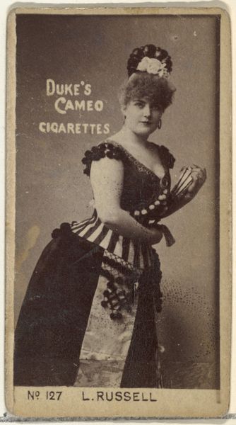 Editor: Here we have "Card Number 97, Rose Coghlan" from the Actors and Actresses series, created in the 1880s by W. Duke, Sons & Co. as a promotional item for Cameo Cigarettes. The piece, now at the Metropolitan Museum of Art, is rendered using photography and printmaking techniques. It’s intriguing how a portrait becomes an advertisement! What do you see in this piece that stands out to you? Curator: The card whispers of celebrity culture in its nascent form, doesn’t it? Note how Rose Coghlan is presented. She’s in costume, poised. These aren't snapshots; they’re carefully constructed images designed to convey a particular persona. What emotional qualities does this evoke for you? Consider what Rose Coghlan might symbolize in the broader cultural landscape of the late 19th century. Editor: I hadn’t thought of it as an early form of branding. It feels almost like a relic now, preserving an actress's image through… cigarettes? There's an odd dissonance there. Do you think this portrait tried to say something about female stage actors in particular? Curator: Precisely! Look at her gaze, slightly averted, perhaps a touch demure, yet confident. Her attire, while ornate, doesn’t scream overt sexuality, does it? Consider how women, especially actresses, were perceived then, caught between societal expectations and the allure of the stage. Her bracelets and necklace also serve as signifiers of wealth and elevated status. This card becomes a cultural artifact, a snapshot – quite literally – of evolving ideas around fame, gender, and commerce. It reveals how cultural memory perpetuates. What have you taken away from considering the work within its cultural context? Editor: The layers are much richer than I initially thought. Seeing it as a document of societal values rather than a simple portrait adds so much depth. Curator: Indeed. Symbols often outlive their original intent, inviting new layers of interpretation.