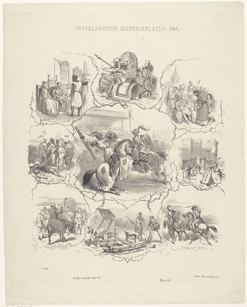 Editor: This is "Portrait of James Fenimore Cooper and nine scenes from his works," a print made by Victor Adam in 1834. I find it a bit…stark. What do you see in this piece beyond a series of illustrations? Curator: Beyond the literal depictions, I see a powerful commentary on early American identity formation, particularly concerning the romanticized but deeply problematic relationship between settlers and Indigenous peoples. Notice how Cooper, framed centrally, is flanked by caricatures of Indigenous figures. This visual positioning immediately sets up a power dynamic. Editor: So, you’re saying it's not just a portrait and scenes from his novels? Curator: Exactly. It's about the narrative being constructed. The scenes, while seemingly adventurous, likely reinforce colonial perspectives on expansion and control. Consider the context: Cooper’s novels often placed white protagonists at the center of narratives involving Indigenous characters, perpetuating a skewed view of history and dispossession. Editor: It seems romantic, but that's a pretty critical perspective. How does the artwork's style affect its message? Curator: The detailed engraving lends a sense of realism, perhaps aiming to legitimize these narratives. But let’s question that realism. Whose reality is being presented? The lack of Indigenous voices or perspectives within these scenes underscores a profound silence and erasure. Think about what stories are being told, and more importantly, whose stories *aren’t* being told. Editor: So the romantic style might actually mask a more complex message of cultural dominance? Curator: Precisely. And that tension is something we need to unpack when we look at art from this period. This image isn’t just an illustration; it's a historical document that reflects the ideologies and power structures of its time. Editor: I'll never look at historical illustrations the same way. It’s like there's a whole other layer beneath the surface. Curator: Absolutely. It's about critically engaging with the narratives art presents, understanding their social and historical roots, and amplifying the voices that have been historically marginalized.