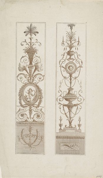 Curator: Take a moment to look at these engravings entitled "Twee arabesken met medaillon en rookvat," dating from sometime between 1700 and 1800. They are currently held here at the Rijksmuseum. Editor: My first thought is: austere. It's all so precise, so rigidly organized, yet brimming with ornamental detail. I'm immediately drawn to the way the engraver coaxed out all this depth with just line work. Curator: Indeed. These pieces reflect the burgeoning Neoclassical revival of the 18th century. We see it in the idealized figures, the balanced compositions... Thinkers like Winckelmann were rediscovering classical antiquity, profoundly influencing art and design. Ornament became more archaeologically correct, or at least, what they perceived as correct. Editor: You see, what fascinates me is that they are engravings meant to function as patterns, as templates. It is an artistic gesture that is also about seriality, transfer, and ultimately, labor. Who made these prints, who consumed them? And how were they then transferred onto, say, furniture or textiles? Curator: Good points! These prints were likely created for artisans and craftsmen. Ornament prints like these democratized design ideas; knowledge wasn’t only in the hands of a few court artists. It changed the very structure of the art world. Editor: Right, so in looking closely at the process of production—engraving, printing, distribution—we can reveal complex relations of power that underpin not just the design, but the entire aesthetic culture of that time. Curator: Exactly. It gives us insights into a period’s values. Even what we might overlook as "mere" ornament reflects cultural and political dynamics at play. Editor: Absolutely. It really shifts my perspective on engravings like this, seeing them less as rarefied objects and more as part of a vast network of production and consumption. Curator: A pertinent reminder of the importance of production practices and the distribution networks that shaped what we see even on the gallery walls. Editor: Yes, an insightful look into this work that highlights both its aesthetic elegance and broader social implications!