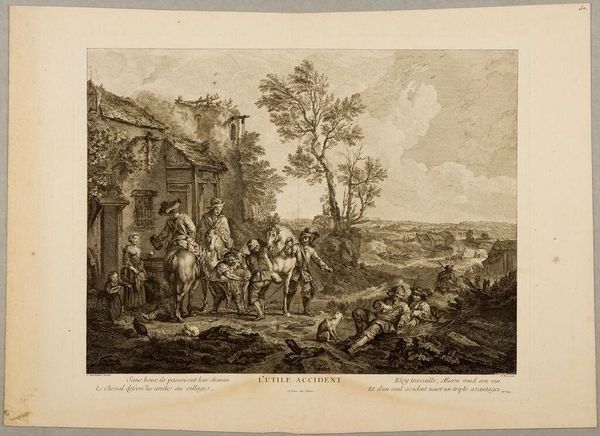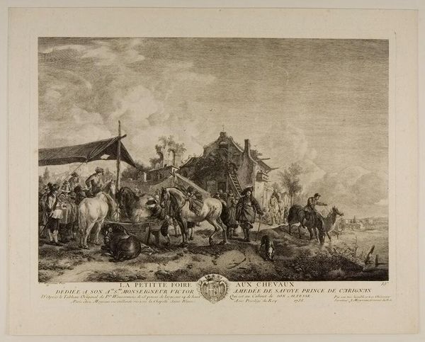 Editor: Here we have Jean Moyreau's "The Presentation of the Hunter," an undated print at the Harvard Art Museums. The scene depicts a bustling hunting party, and I'm struck by the sheer amount of activity. What do you make of it? Curator: As a print, its materiality is key. Consider the labor involved: the engraver's skill, the printing process, and its potential for mass production. This contrasts with the aristocratic subject matter, depicting a leisure activity funded by exploitation. The print itself becomes a commodity, circulating images of power and privilege. Editor: So, the very means of making the art comments on its subject? Curator: Precisely. The contrast between the elite's leisurely pursuits and the labor required to produce and circulate this image reveals social and economic tensions. The print becomes a site where power and its representation are negotiated. Editor: I never thought about it that way; it definitely shifts my perspective on the scene portrayed. Thanks! Curator: Indeed, examining the means of production opens up entirely new avenues for interpretation.
