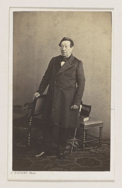 This is Maurits Verveer's photograph, "Portret van een man, zittend," housed in the Rijksmuseum. The oval format, with its somber tones, immediately suggests a study in contrasts and containment. Notice how Verveer uses light and shadow to articulate form, particularly in the subject's face and clothing. The sharp focus on the sitter's gaze invites scrutiny, while the soft gradations in the background push him forward. The composition is structured to emphasize the man's presence, his dark suit and the ornate chair framing a central figure. The image becomes a system of signs, where posture, dress, and setting operate as codes of identity and status. Consider the photograph as more than just a representation; it's a constructed image, where formal elements combine to suggest both individual character and broader social meanings. How does Verveer's work challenge or reinforce our understanding of portraiture in the 19th century? The photograph, through its materiality and composition, invites ongoing interpretation.